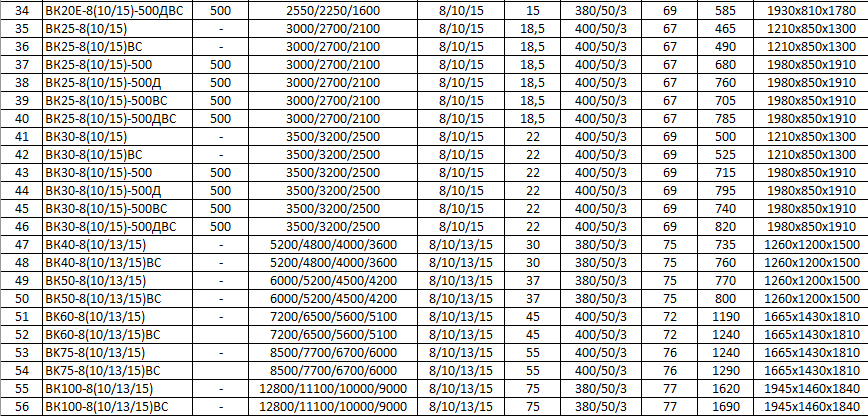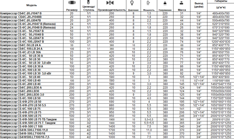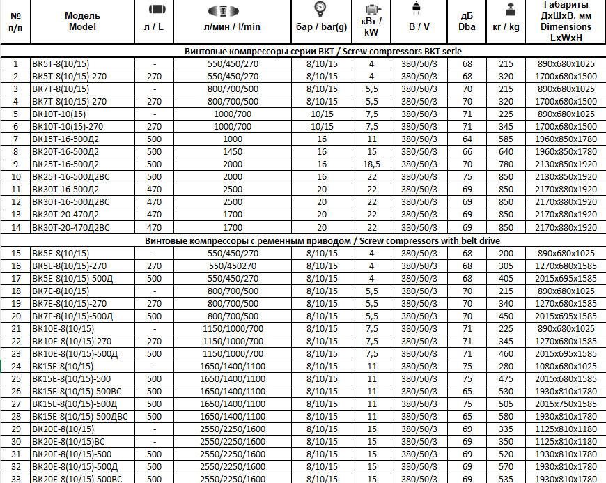 В настоящий момент ООО «КОМПМАШ» предлагает следующий ассортимент компрессорного оборудования: • винтовые маслозаполненные компрессоры с воздушным охлаждением и давлением на выходе 5-15 атм и мощностью электродвигателя 4-200 кВт; • ресиверы объемом 270-500 литров на давление 10-16 атм • поршневые компрессоры давлением 8-16 атм., мощностью электродвигателя 1,1-22 кВт; • поршневые безмасляные компрессоры в шумопоглощающем кожухе (стоматологические); • поршневые компрессоры среднего давления с выходным давлением 30-40 атм и мощностью электродвигателя 7,5-15 кВт; • дожимающие поршневые компрессоры (бустеры) с давлением на выходе 25-35 атм и мощностью электродвигателя 15-22 кВт;
